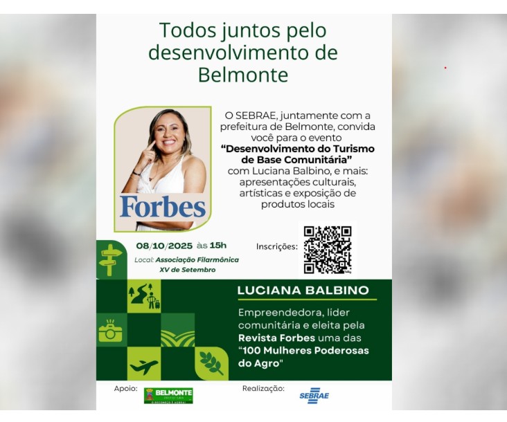 A Prefeitura de Belmonte, em parceria com o SEBRAE, realizará um evento focado no Desenvolvimento do Turismo de Base Comunitária no dia 8 de outubro. O encontro, que acontecerá na Associação Filarmônica XV de Setembro, às 15h, busca capacitar e envolver a comunidade para impulsionar o setor turístico na região. O ponto alto da programação é a palestra de Luciana Balbino, empreendedora e líder comunitária. Reconhecida por sua atuação no turismo rural, ela foi eleita uma das 100 Mulheres Poderosas do Agronegócio pela revista Forbes. Sua vasta experiência tem como objetivo inspirar a criação de novas ideias e projetos na cidade, valorizando a cultura e os produtos locais.
