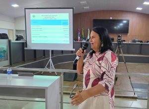 A contadora Ivani Santana, responsável pela contabilidade do Legislativo Municipal, apresentou a prestação de contas quadrimestral da Câmara de Eunápolis à Comissão de Finanças e Fiscalização, detalhando receitas, despesa bruta (pessoal, encargos) e despesas de capital (equipamentos).