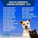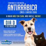 A Prefeitura de Eunápolis, por meio da Secretaria de Saúde, realizará neste sábado, 11/08, a Campanha Anual de Vacinação Antirrábica para Cães e Gatos. Com 25 postos de vacinação funcionando das 08h às 17h, vacinando cães e gatos com idade acima de 03 meses, o objetivo é imunizar 80% do quantitativo estimado de animais no município.