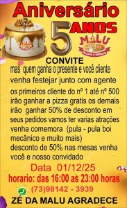 A famosa Pizzaria Malu, situada na cidade de Eunápolis, completa cinco anos, na próxima segunda-feira, 01, de dezembro, e para comemorar esta importante data, está dando de presente inéditas promoções especiais, grandes surpresas, e muitas pizzas super especiais, que só a Malu tem.