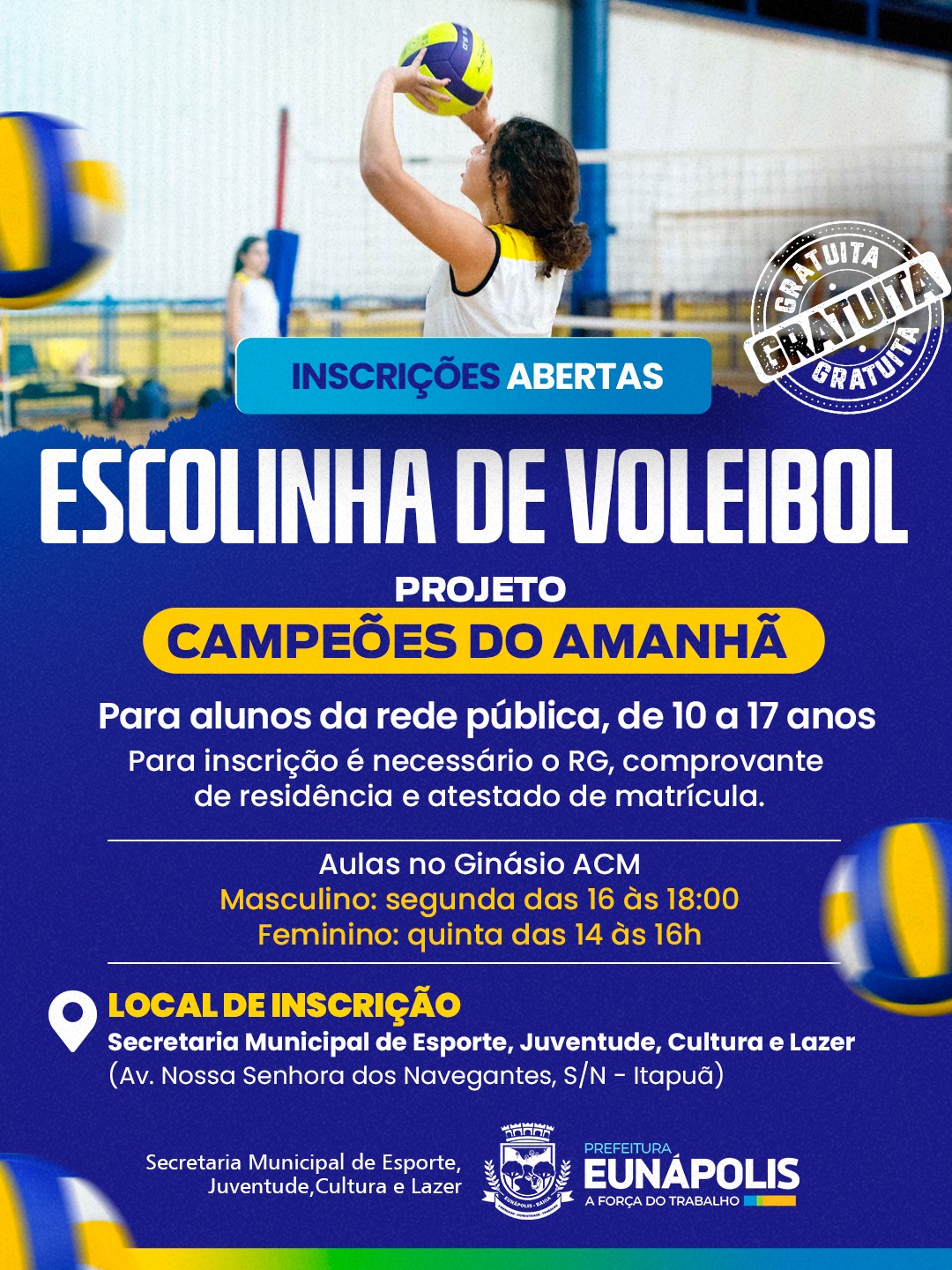 A Prefeitura de Eunápolis, por meio da Secretaria de Esporte, Cultura, Juventude e Lazer, está com inscrições abertas para a Escolinha de Voleibol, iniciativa do Projeto Campeões do Amanhã, voltada para estudantes da rede pública, com idades entre 10 e 17 anos.