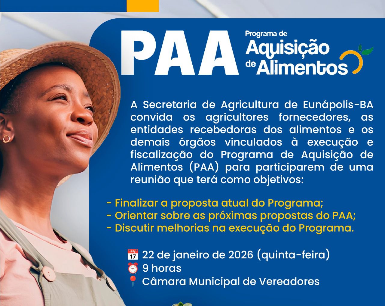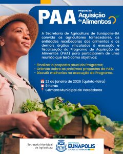 A Prefeitura de Eunápolis, por meio da Secretaria Municipal de Agricultura, realizará uma reunião com agricultores fornecedores, entidades recebedoras e órgãos envolvidos na execução e fiscalização do Programa de Aquisição de Alimentos (PAA). O encontro é para alinhar ações e fortalecer a operacionalização do Programa no município.