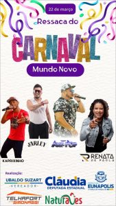 Como acontece todos os anos, o vereador Ubaldo Suzart está promovendo a festa “Ressaca de Carnaval”, que acontece no domingo, dia 22 de março. Morador da localidade há mais de três décadas, o evento é uma celebração aos clássicos contagiantes do Carnaval com as bandas Axé Pop e os cantores Jarley, Kaprixinha e Renata de Paula.